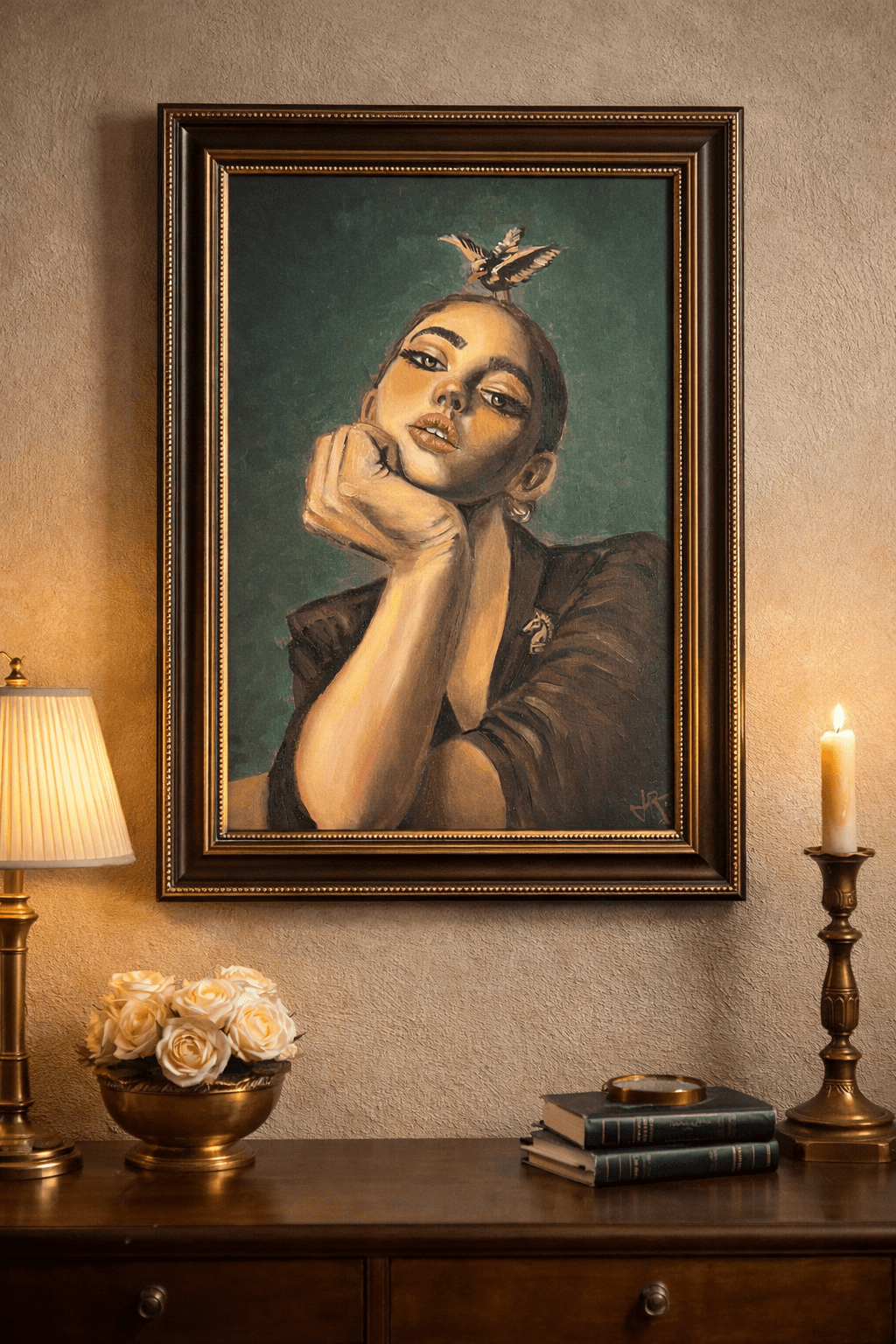 This portrait is built from pause. The figure inhabits a suspended moment of concentration, where the gaze is not directed outward but toward inner calculation. The tight composition and sober background remove narrative noise, transforming the gesture into a space of containment and control.